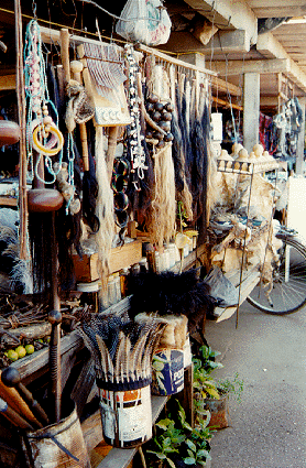 At the right appears a stall containing materials used by traditional healers, who have their own association and retain considerable power. [Click here for a larger image.]