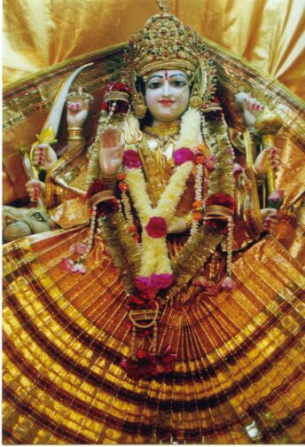Lakshmi, the Goddess of Wealth and Prosperity, worshipped on the occasion of Deepavali. The imagery is typical of a North Indian temple.