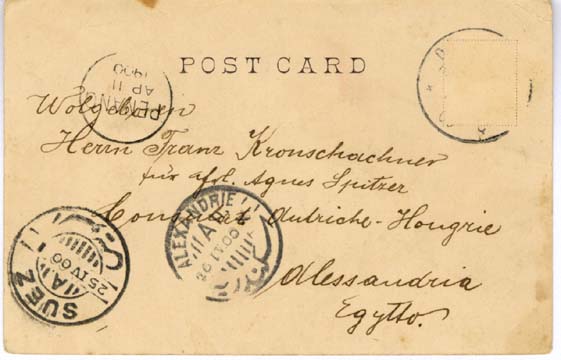 Singapore [Lily Pond]. Dated by hand: "9/4/[1]900." Published by "Verlag v. Albert Aust, Hamburg." Postmarked at its Eygptian preliminary and final destinations: "Suez 20 IV 00" and "Alexandrie 26 IV 00"-- Reverse.
