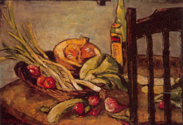 In the Kitchen by Ng Eng Teng (nationality: Singaporean). Year: 1960. Medium: Oil on board. Size: 55.5 x 80cm.