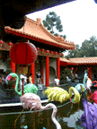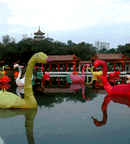 Right: Illuminated paper tigers in their corral. Middle: a scene from the large tent with scenes and some more traditional lanterns -- a flying paper tiger, wings and all, about to pounce on GPL. (photo: Ruth M. Landow). Left: the lagoon at early dusk with the large pagoda in the background. Below we have a view from approximately the same location after darkness arrived.